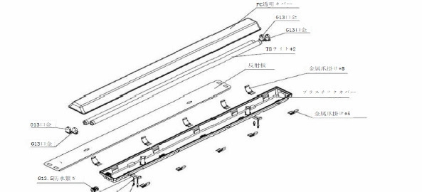 VED認証ソケット(2A 500V)G13口金、中国製;PSE認証端子台(20A 300V)日本製;PSE認証電線(0.75MM 芯銅線)中国製;給電方式:片側給電又は両側給電。